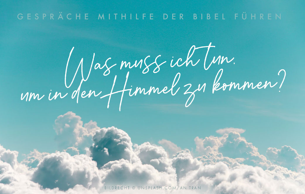 Eine der wirkungsvollsten Fragen in Gesprächen über den Glauben ist: Was muss ein Mensch tun, um in den Himmel zu kommen? Sie öffnet Einblicke in die Glaubensvorstellungen des Gesprächspartners und bietet eine großartige Gelegenheit, Aspekte des Evangeliums zu erklären. Hierzu kann man ideal Gott selbst durch das Lesen seines Wortes sprechen lassen. Auch heute wollen wir uns wieder ein konkretes Szenario vornehmen und gemeinsam überlegen, was genau wir zu unserem Gesprächspartner sagen können, um etwas von unserem Glauben weiterzugeben.